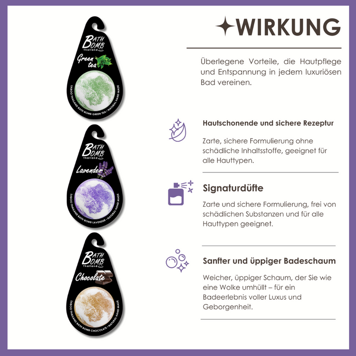 🌿 Frischer Grüner Tee · 💜 Entspannender Lavendel · 🍫 Cremiger Choco Latte — wählen Sie Ihr Bade-Erlebnis nach Stimmung