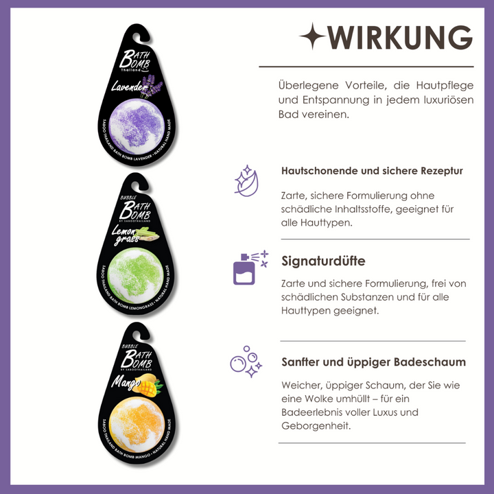 3 Badebomben (je 1x Lavendel, 1x Zitronengras, 1x Mango)