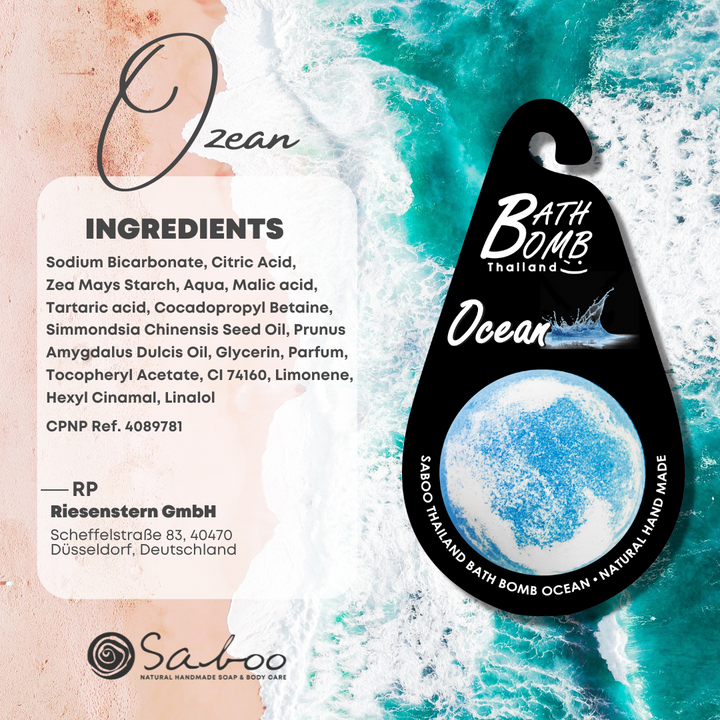 Ozean: Natriumbicarbonat, Zitronensäure, Maisstärke, Wasser, Apfelsäure, Weinsäure, Cocamidopropyl Betaine, Jojobaöl (Simmondsia Chinensis Seed Oil), Süßmandelöl (Prunus Amygdalus Dulcis Oil), Glycerin, Parfum, Tocopherylacetat, CI 74160, Limonene, Hexyl Cinnamal, Linalool