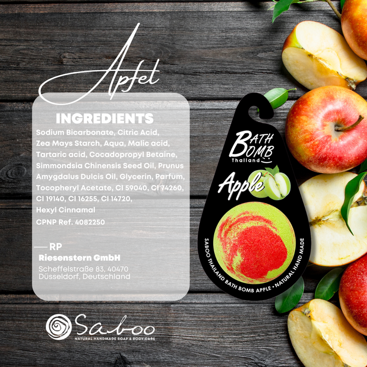 Apfel: Natriumbicarbonat, Zitronensäure, Maisstärke, Wasser, Äpfelsäure, Weinsäure, Cocamidopropyl Betaine, Jojobaöl (Simmondsia Chinensis Seed Oil), Süßmandelöl (Prunus Amygdalus Dulcis Oil), Glycerin, Parfum, Tocopherylacetat, CI 59040, CI 74260, CI 19140, CI 16255, CI 14720, Hexyl Cinnamal