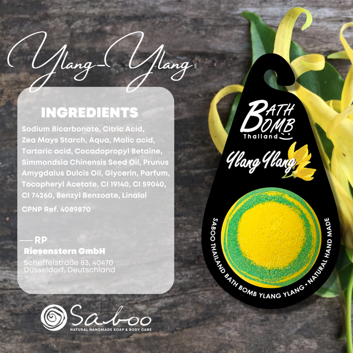 Ylang-Ylang: Natriumbicarbonat, Zitronensäure, Maisstärke, Wasser, Äpfelsäure, Weinsäure, Cocamidopropyl Betaine, Jojobaöl (Simmondsia Chinensis Seed Oil), Süßmandelöl (Prunus Amygdalus Dulcis Oil), Glycerin, Parfüm, Tocopherylacetat, CI 19140, CI 59040, CI 74260, Benzylbenzoat, Linalool