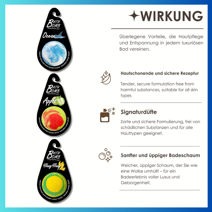 3 Badebomben (je 1x Ozean, 1x Apfel, 1x Ylang-Ylang)