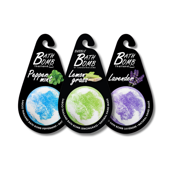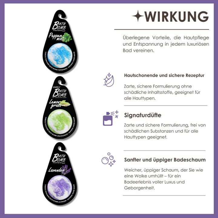 3 Badebomben (je 1x Pfefferminze, 1x Zitronengras, 1x Lavendel)