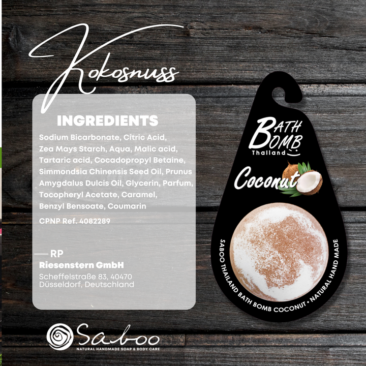 Kokosnuss: Natriumbicarbonat, Zitronensäure, Maisstärke, Wasser, Äpfelsäure, Weinsäure, Cocamidopropyl Betaine, Jojobaöl (Simmondsia Chinensis Seed Oil), Süßmandelöl (Prunus Amygdalus Dulcis Oil), Glycerin, Parfum, Tocopherylacetat, Karamell, Benzyl Benzoate, Coumarin