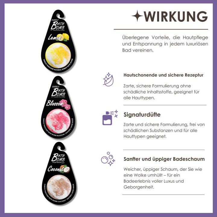 3 Badebomben (je 1x Zitrone, 1x Blossom, 1x Kokosnuss)