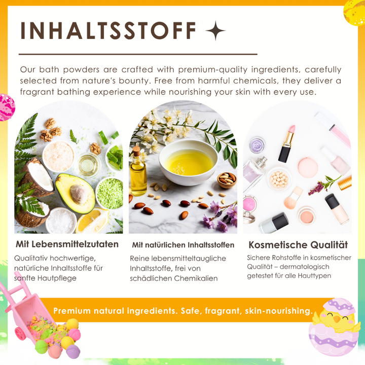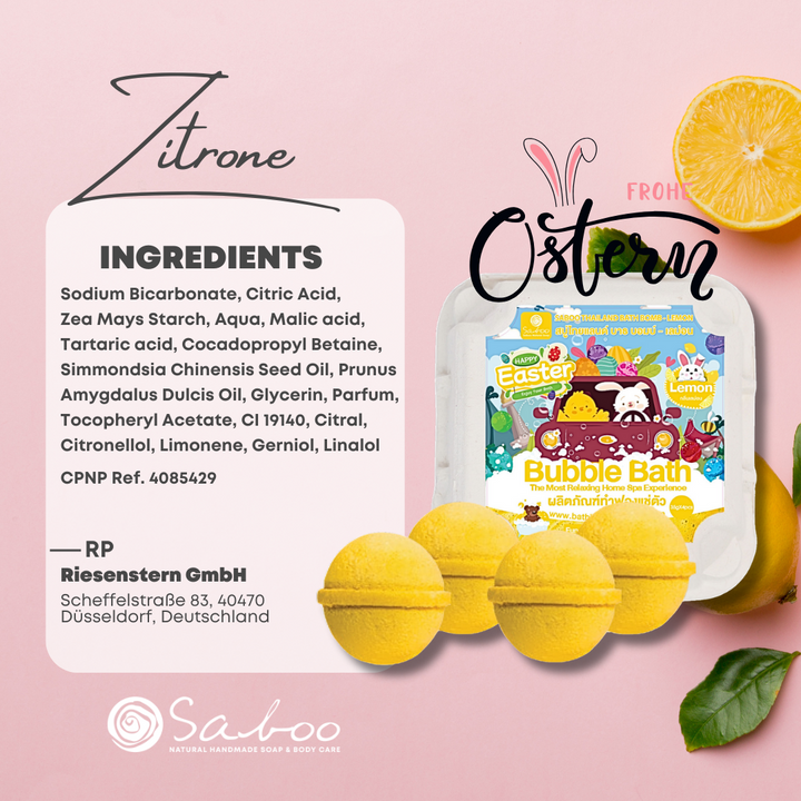 Natriumbicarbonat, Zitronensäure, Maisstärke, Wasser, Äpfelsäure, Weinsäure, Cocamidopropyl Betaine, Jojobaöl (Simmondsia Chinensis Seed Oil), Süßmandelöl (Prunus Amygdalus Dulcis Oil), Glycerin, Parfum, Tocopherylacetat, CI 19140, Citral, Citronellol, Limonene, Geraniol, Linalool