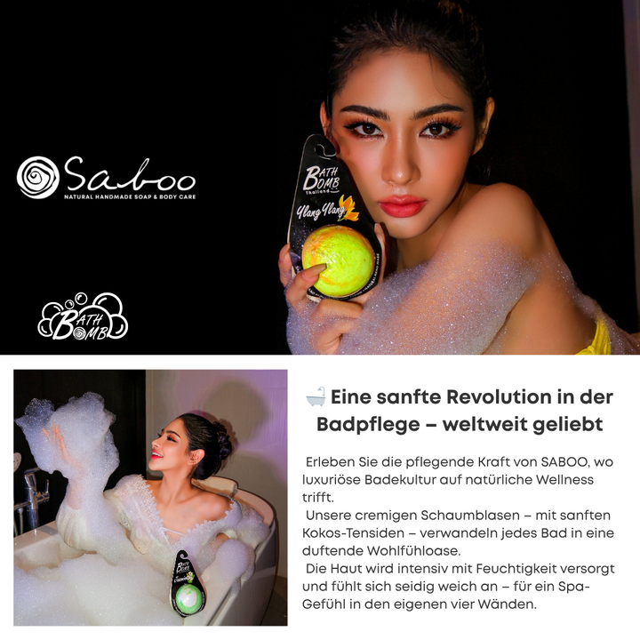 Die SABOO Badebombe ist kein gewöhnlicher Badezusatz. Sie erzeugt einen einzigartigen, extra dichten und cremigen Schaum, wie man ihn in Europa kaum kennt. Frei von SLS (Sodium Lauryl Sulfate) und SLES (Sodium Laureth Sulfate), hebt sie sich deutlich von herkömmlichen, minderwertigen Produkten ab.