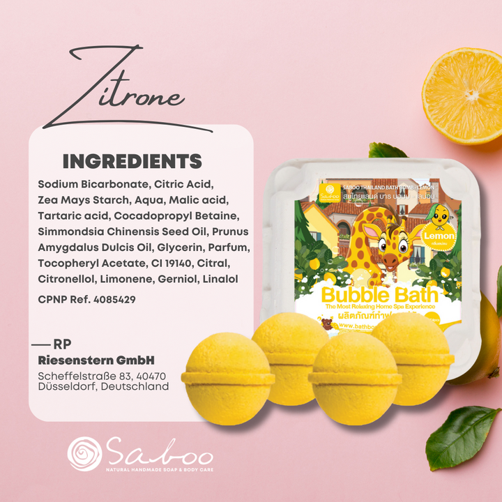 Natriumbicarbonat, Zitronensäure, Maisstärke, Wasser, Äpfelsäure, Weinsäure, Cocamidopropyl Betaine, Jojobaöl (Simmondsia Chinensis Seed Oil), Süßmandelöl (Prunus Amygdalus Dulcis Oil), Glycerin, Parfum, Tocopherylacetat, CI 19140, Citral, Citronellol, Limonene, Geraniol, Linalool