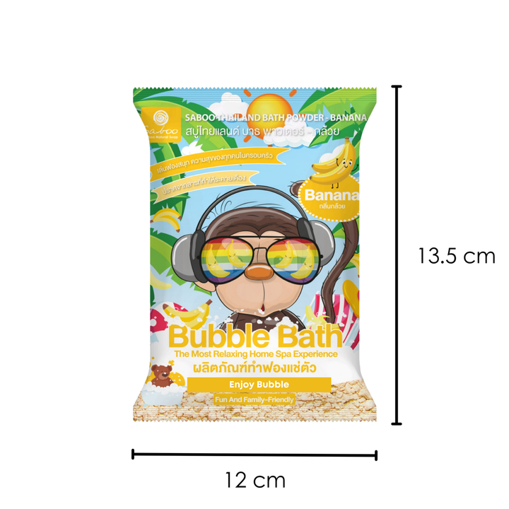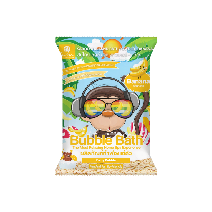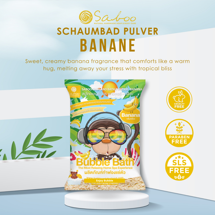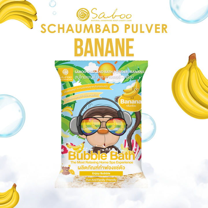 SABOO Banana Bath Powder mit seinem süßen und weichen Bananenduft hüllt das Badezimmer in eine warme, behagliche Atmosphäre. Die fröhliche Verpackung mit einem niedlichen Affen mit Sonnenbrille zieht die Aufmerksamkeit von Kindern sofort auf sich.
